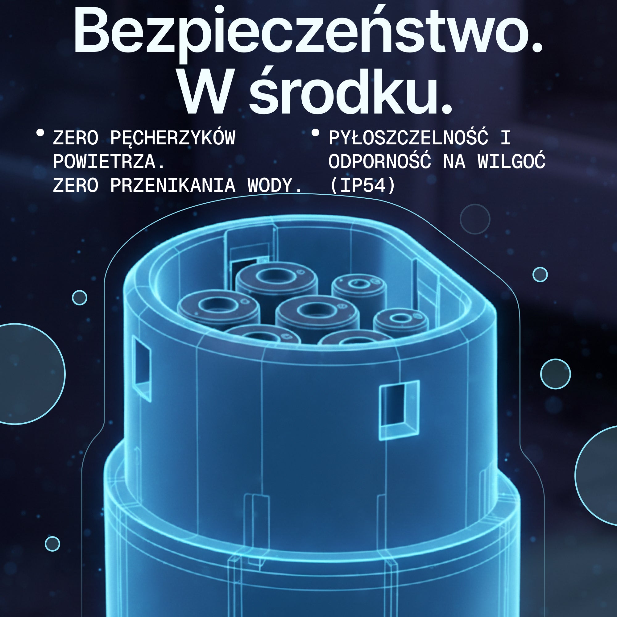 Wtrysk TPU bez pęcherzyków powietrza – wnętrze wtyczki całkowicie wypełnione TPU bez pęcherzyków powietrza. Zero pustych przestrzeni. Woda fizycznie nie może się dostać, ponieważ nie ma gdzie się podziać.