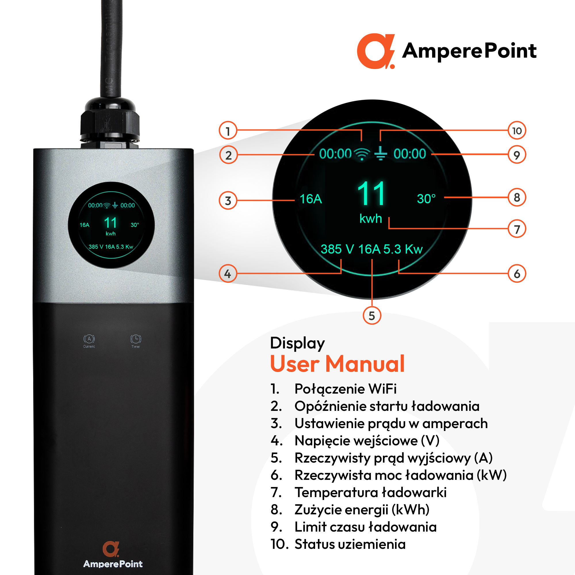 Produkt wyposażony jest w wielofunkcyjny wyświetlacz LCD o przekątnej 2,4", który zapewnia dostęp do wszystkich najważniejszych funkcji, takich jak precyzyjna moc ładowania, czas ładowania, natężenie prądu, które można regulować za pomocą przycisku "A", oraz monitorowanie w czasie rzeczywistym temperatury pracy ładowarki, wszystko w zasięgu ręki.