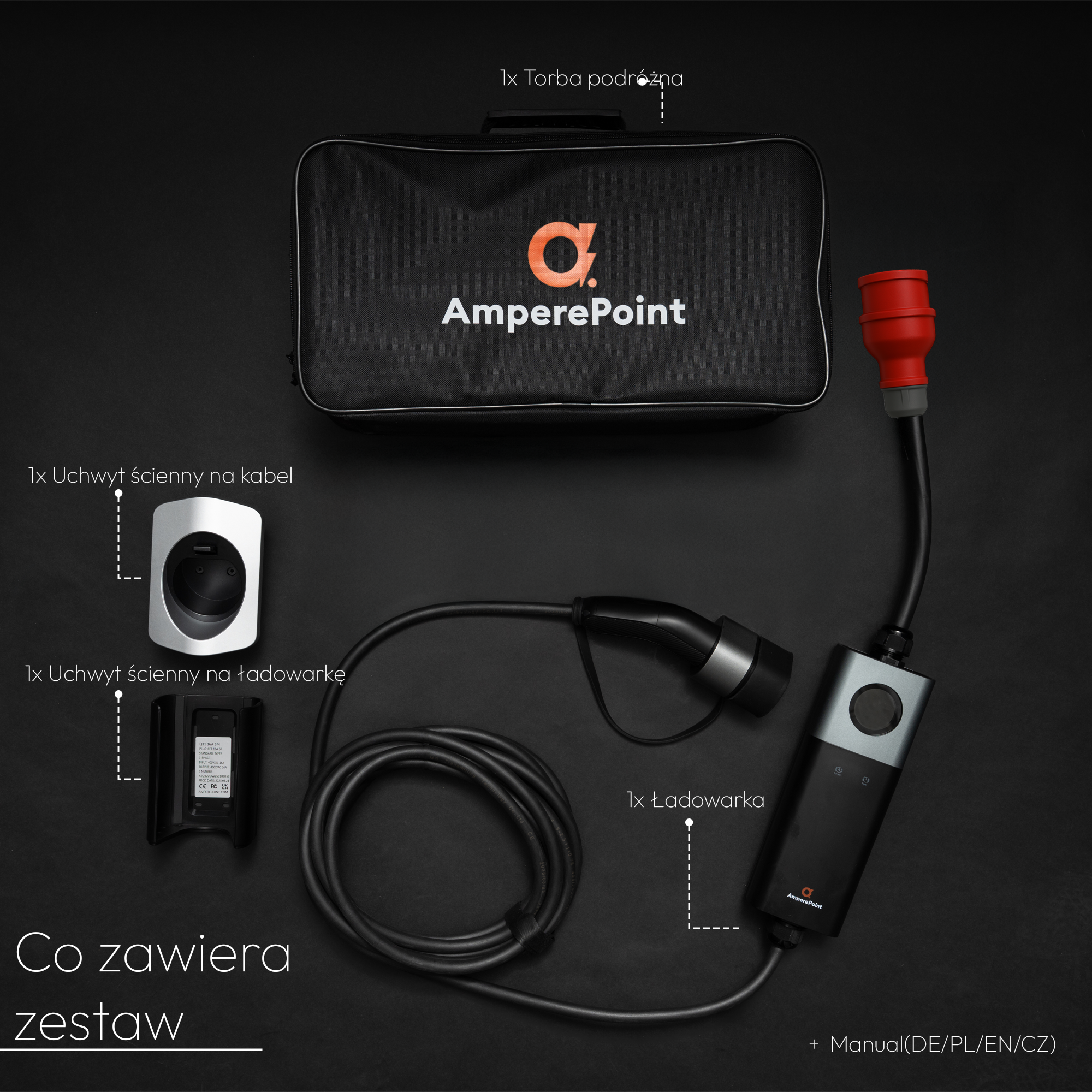 W zestawie z ładowarką znajduje się uchwyt ścienny na kabel oraz uchwyt na samo urządzenie, co umożliwia wygodny montaż na ścianie. To rozwiązanie nie tylko oszczędza miejsce, ale także pomaga utrzymać porządek i estetykę w garażu, na podjeździe czy w miejscu pracy. Dzięki temu ładowarka jest zawsze pod ręką i gotowa do użycia, a przewody pozostają schludnie uporządkowane i nie leżą na ziemi.