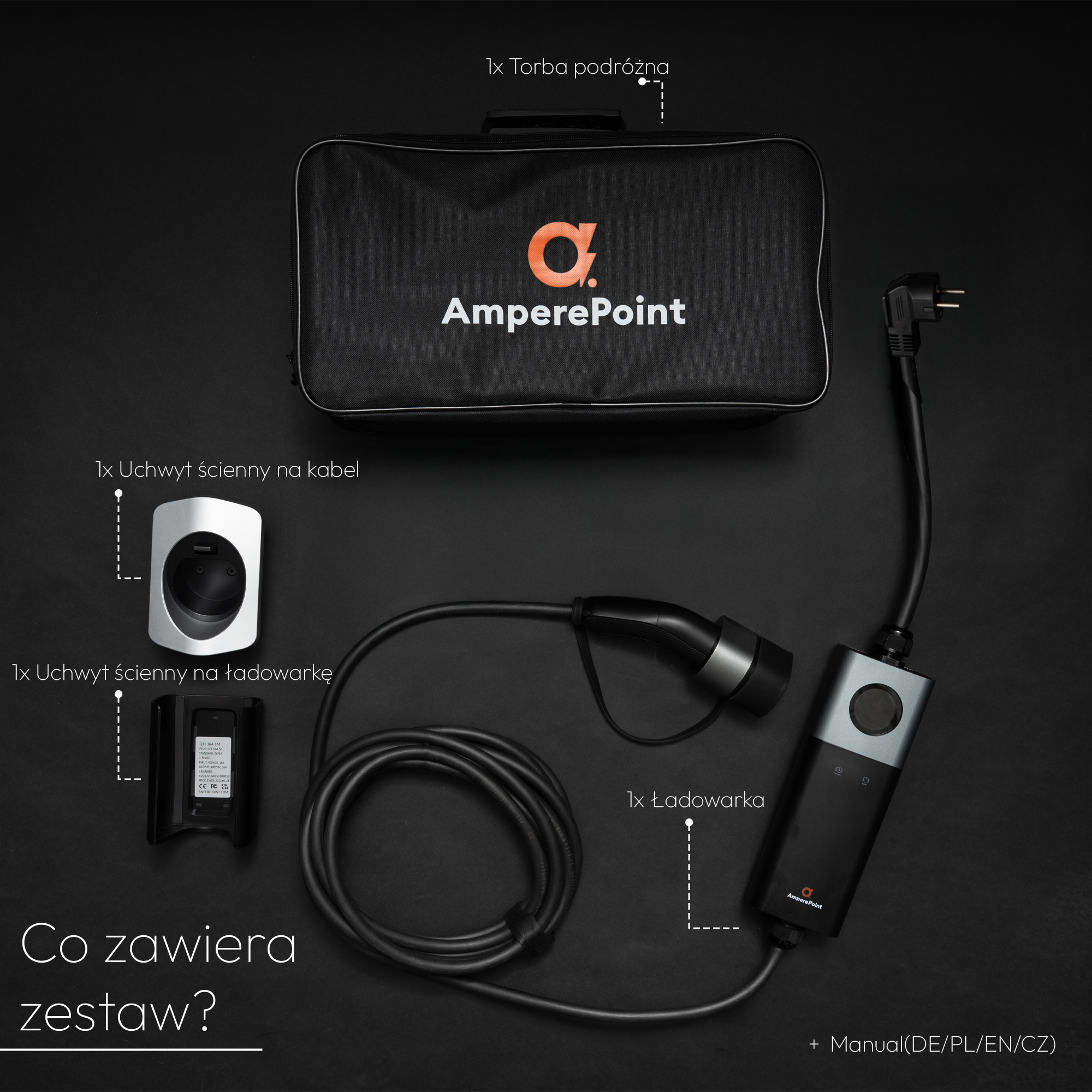 W zestawie z ładowarką znajduje się uchwyt ścienny na kabel oraz uchwyt na samo urządzenie, co umożliwia wygodny montaż na ścianie. To rozwiązanie nie tylko oszczędza miejsce, ale także pomaga utrzymać porządek i estetykę w garażu, na podjeździe czy w miejscu pracy. Dzięki temu ładowarka jest zawsze pod ręką i gotowa do użycia, a przewody pozostają schludnie uporządkowane i nie leżą na ziemi.